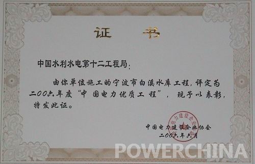 白溪水库工程获中国电力优质工程