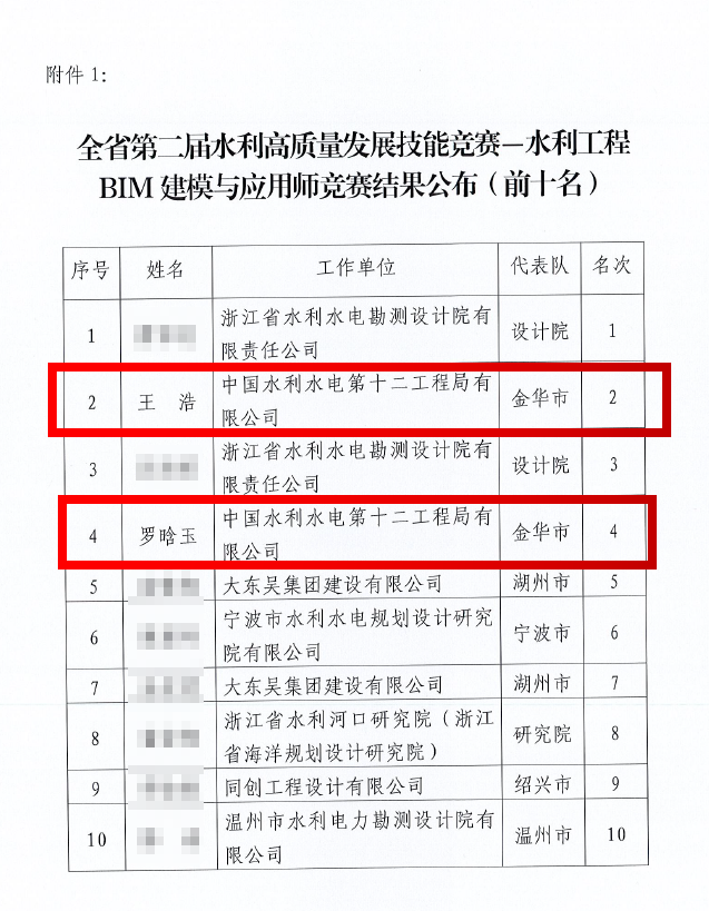 11月7日至8日,由浙江省水利厅、浙江省总工会联合主办,浙江同济科技职业学院承办的全省第二届水利高质量发展技能竞赛——水利工程BIM建模与应用师赛项在浙江同济科技职业学院顺利举办。公司选派三名选手参赛,由科技与数字化部组织并带队出征。参赛选手凭借扎实的专业基础和出色的现场发挥,最终荣获个人一等奖1项、二等奖1项,展现了公司在BIM技术应用领域的强劲实力与专业化管理水平。 本次竞赛为省级行业职业技能竞赛,吸引了来自全省各地市及厅属单位的众多优秀选手同台竞技。竞赛内容涵盖理论知识考试与实际操作考核两部分,其中实际操作重点考查选手基于Revit软件进行水利工程BIM模型构建、参数化设计、复杂节点识别以及模型综合应用能力,全面检验参赛者的专业技术水平和综合素养。 经过激烈角逐,公司职工王浩以总分第二名的优异成绩荣获个人一等奖,并凭借此佳绩,经浙江省总工会核准,被授予“浙江金蓝领”省级技能人才最高荣誉;罗晗玉以第四名的成绩斩获个人二等奖,并获授“浙江省水利技术能手”称号。此外,由公司选手作为主力代表的金华市代表队亦荣获竞赛团体二等奖,充分体现了公司在团队协作与整体技术实力上的优势。此次优异成绩的取得,是参赛选手刻苦钻研、奋勇拼搏的结果,也离不开公司在技术积累、人才选拔与赛事组织方面的专业支撑与有力保障。此次获奖及荣誉,不仅是对公司职工精湛专业技能的高度认可,也进一步彰显了公司在BIM技术研发、应用与高技能人才培养方面的领先水平,有力提升了企业的行业影响力与品牌形象。未来,公司将继续坚持以人才为根本、以技术为驱动,持续加大BIM技术人才的培养力度,推动BIM技术在水利工程全生命周期中的深度融合与创新应用,为行业高质量发展贡献更多力量。