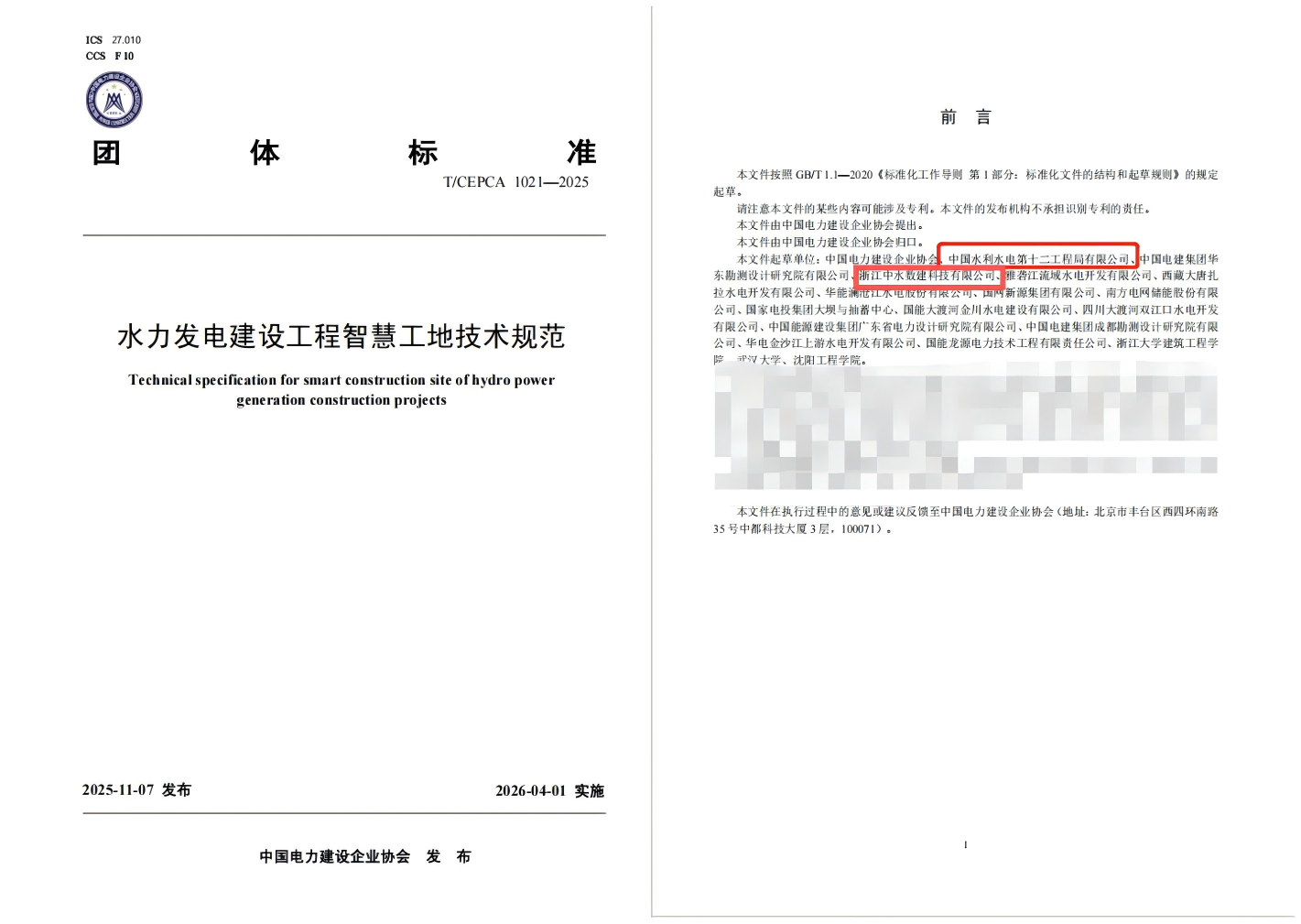 公司主编的《水力发电建设工程智慧工地技术规范》正式发布